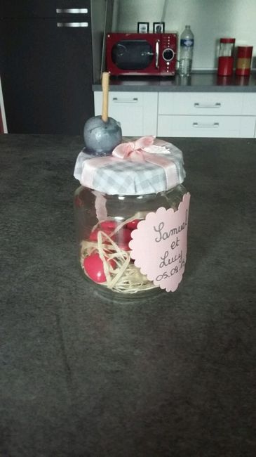 Bonsoir à toutes je réalise moi même mes dragées. Mon thème est la gourmandise avec les couleurs rose clair et gris. Je voulais faire un pot de confiture avec une pomme d'amour dessus qui est le nom de ma table d'honneur. J'ai gardé les pots de...