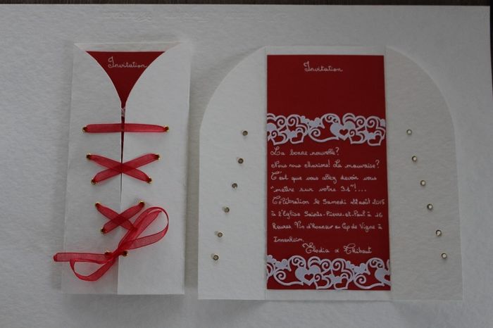 Bonjour à tous, je voudrai avoir un avis sur mes cartes d'invitation. J'ai pensé à cette couleur pour annoncer le thème de la soirée, et le laçage avec les oeillets pour rappeler celui de la robe. Merci de faire part de vos impressions