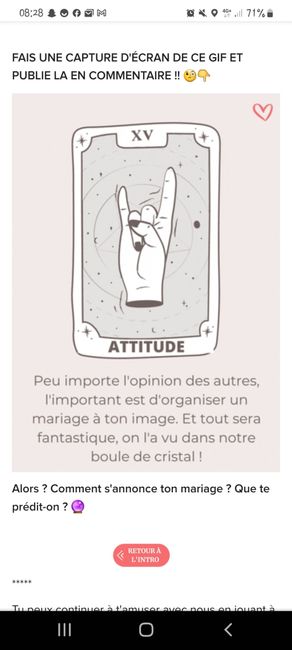 Coucou tout le monde 💜 Merci d'avoir participé jusqu'au bout ! Maintenant qu'on en sait un peu plus sur ton mariage, on va pouvoir tirer les cartes... FAIS UNE CAPTURE D'ÉCRAN DE CE GIF ET PUBLIE LA EN COMMENTAIRE !! 🧐👇 Alors ? Comment s'annonce ton...