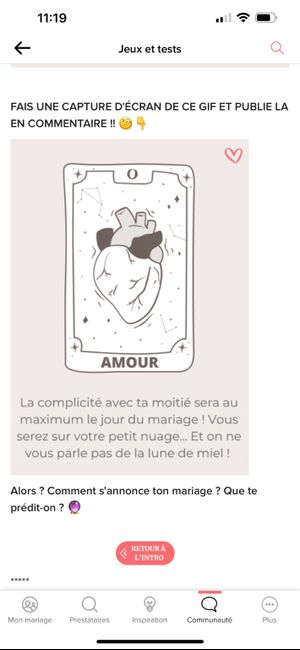 Coucou tout le monde 💜 Merci d'avoir participé jusqu'au bout ! Maintenant qu'on en sait un peu plus sur ton mariage, on va pouvoir tirer les cartes... FAIS UNE CAPTURE D'ÉCRAN DE CE GIF ET PUBLIE LA EN COMMENTAIRE !! 🧐👇 Alors ? Comment s'annonce ton...