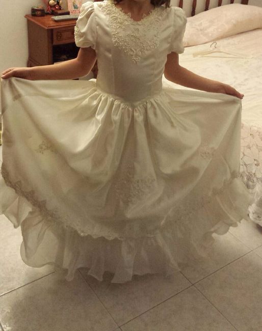 Salut les filles, il y a quelques jours ma belle soeur m'envoie des photos et m'annonce que ma filleule qui sera ma petite DH veut absolument porter la robe que j'avais pour ma communion quand j'avais 9 ou 10ans j'ai trouvais ça vraiment trop mignon...