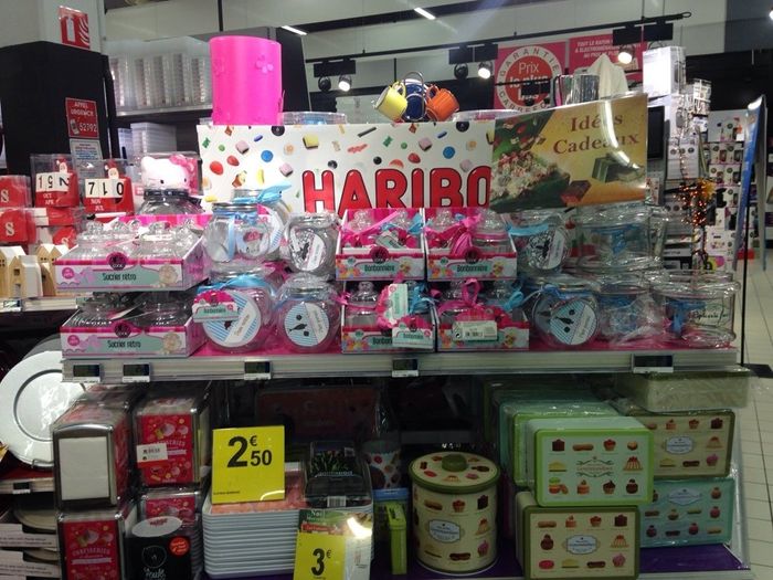 Coucou tous le monde, ce soir en faisant mes courses a carrefour je suis passé devant un petit rayon avec plusieurs sortes de bonbonnières et autres boîtes hyper jolies idéales pour un candy bar.Personnellement je n'en fait pas mais si ça peut aider...