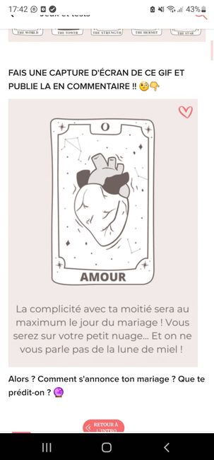 Coucou tout le monde đ Merci d'avoir participĂ© jusqu'au bout ! Maintenant qu'on en sait un peu plus sur ton mariage, on va pouvoir tirer les cartes... FAIS UNE CAPTURE D'ĂCRAN DE CE GIF ET PUBLIE LA EN COMMENTAIRE !! đ§đ Alors ? Comment s'annonce ton...