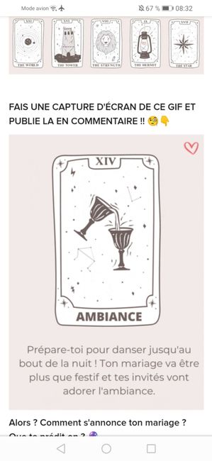 Coucou tout le monde 💜 Merci d'avoir participé jusqu'au bout ! Maintenant qu'on en sait un peu plus sur ton mariage, on va pouvoir tirer les cartes... FAIS UNE CAPTURE D'ÉCRAN DE CE GIF ET PUBLIE LA EN COMMENTAIRE !! 🧐👇 Alors ? Comment s'annonce ton...