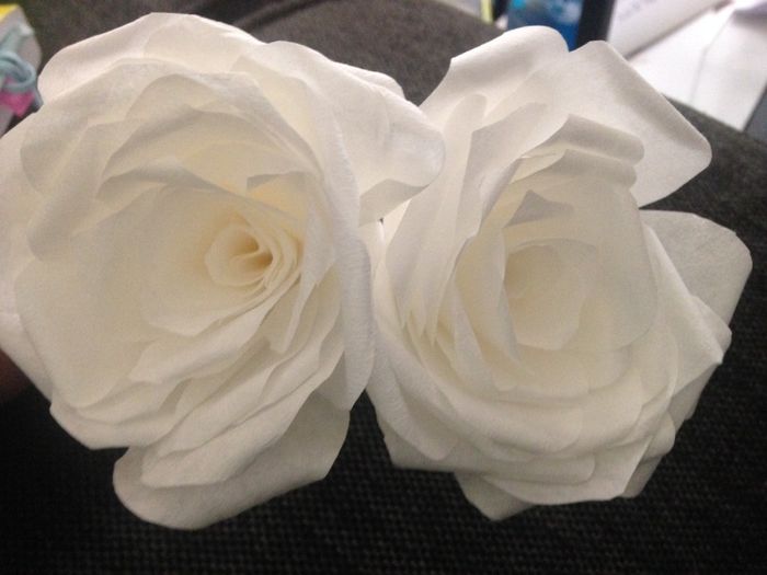 Bonjour, Voici mes essais de lundi pour ma déco, pour l'instant tout est en blanc, quand j'aurais choisit les modèles et le papier ça sera en couleur: pêche et vert d'eau! - fleurs en papier classique: elles sont trop rigides donc je ne vais pas...