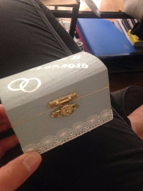 coucou Voici nos alliances avec ma bague de fiançaille (que je n'ai plus le droit de porter jusqu'au mariage car elle a été nettoyé pour avoir la même brillance que l'alliance). Je les ai mises dircetement dand le petit coffre que j'ai décoré. Le...