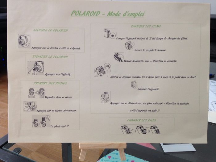 Coucou Voici les éléments de mon coin polaroid. polaroid 1: la note d'utilisation de l'appareil polaroid 2 polaroid 3: le coin pola et livre d'or devrait ressembler à ça avec l'urne dans le coin droit au fond. Derrière le mode d'emploi du pola il y...
