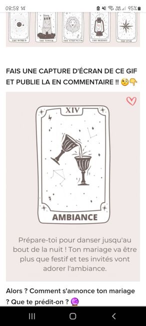 Coucou tout le monde 💜 Merci d'avoir participé jusqu'au bout ! Maintenant qu'on en sait un peu plus sur ton mariage, on va pouvoir tirer les cartes... FAIS UNE CAPTURE D'ÉCRAN DE CE GIF ET PUBLIE LA EN COMMENTAIRE !! 🧐👇 Alors ? Comment s'annonce ton...