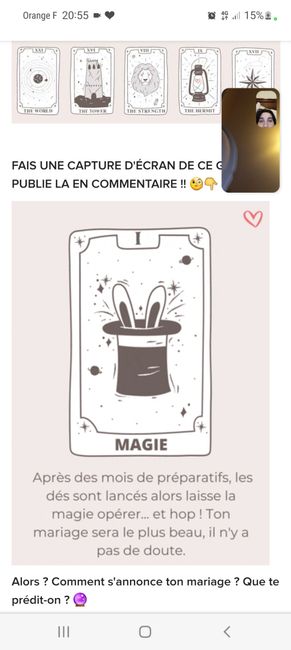 Coucou tout le monde 💜 Merci d'avoir participé jusqu'au bout ! Maintenant qu'on en sait un peu plus sur ton mariage, on va pouvoir tirer les cartes... FAIS UNE CAPTURE D'ÉCRAN DE CE GIF ET PUBLIE LA EN COMMENTAIRE !! 🧐👇 Alors ? Comment s'annonce ton...
