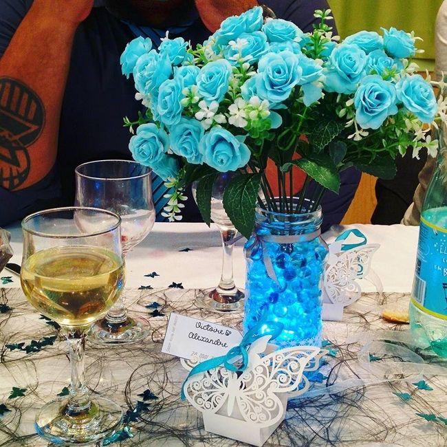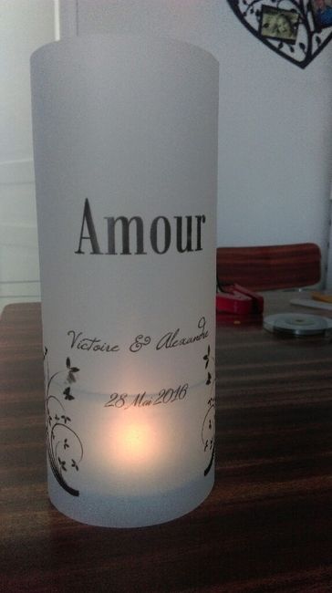 Bonsoir à tous !! Comme convenu précédemment j'avais opté pour le photophore pour présenter le nom de la table et non le menu.Alors à J-91 je m'y colle. En voici déjà 4 , par contre je doute avec ou sans le Ruban blanc.Qu en pensez vous ? ...