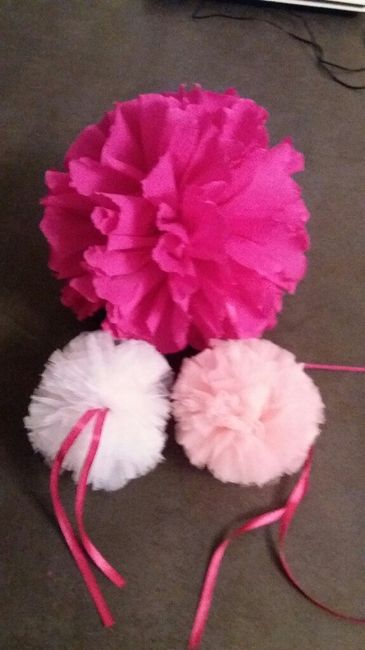 Coucou tout le monde! Je suis trop fière de moi. J'ai commencé à faire les pompons en tulles et les fleurs en papier crepon. Et je vous montre le rendu car je les trouvent très jolis. Quu'est ce que vous en pensez? Bon je dois encore m'améliorer
