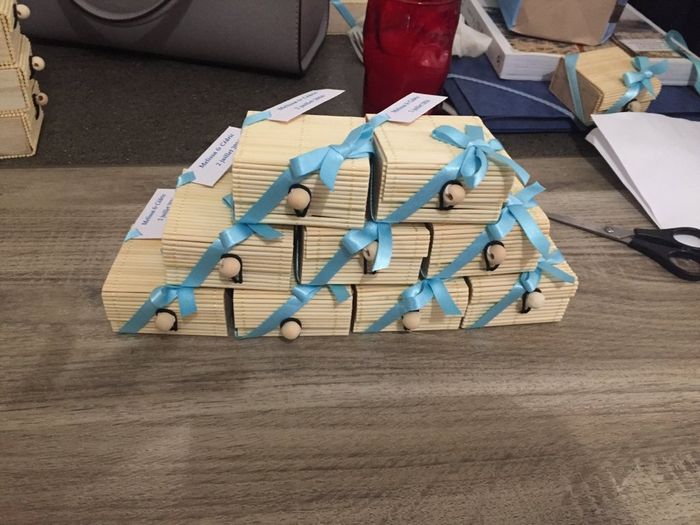 On a tout les dragées et les contenants !! Super me direz vous ? Jusque là je suis d'accord mais alors viens le moment de les remplir et de faire les petits noeuds sur le joli ruban et la ça de vient critique !!150 boîtes à faire mais pour le moment...