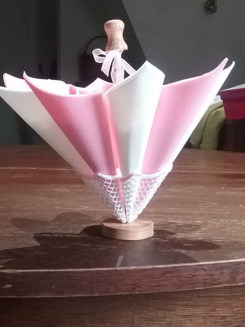 Voilà, je partage ma joie d'avoir trouvé une idée sympa pour mes serviettes de table. Je n'avais pas envie de me farcir 155 serviettes de table à plier alors voilà j'ai trouvé un couple qui m'a fabriqué de jolies ombrelles pour mon mariage thème...