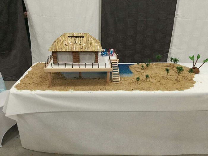 Voilà notre urne quasi finie (manque l'escalier). Elle sera posée sur un décor mer et du vrai sable Urne quasi finie Urne quasi finie