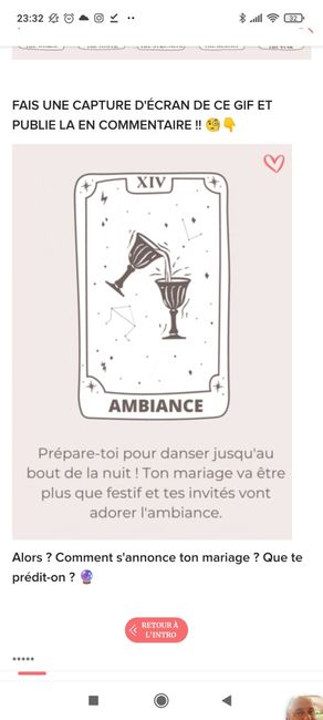 Coucou tout le monde 💜 Merci d'avoir participé jusqu'au bout ! Maintenant qu'on en sait un peu plus sur ton mariage, on va pouvoir tirer les cartes... FAIS UNE CAPTURE D'ÉCRAN DE CE GIF ET PUBLIE LA EN COMMENTAIRE !! 🧐👇 Alors ? Comment s'annonce ton...