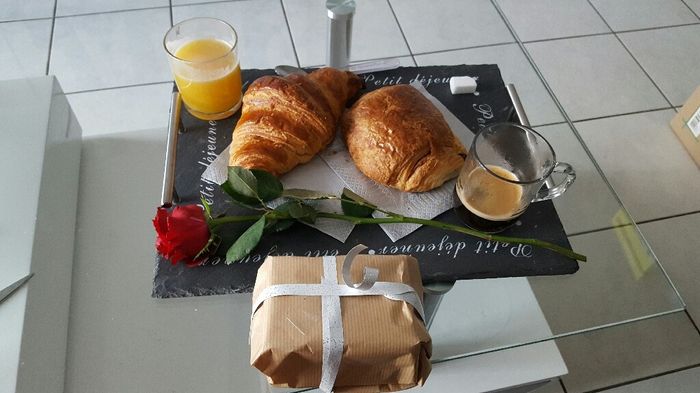 Aujourd'hui je souffle ma 26ème bougie et j'ai vraiment un homme attention? réveil tout en douceur petit déjeuner au lit un cadeau et un beau bouquet que rêver de mieux je ne peux lui dire que oui ahhhh l'amour