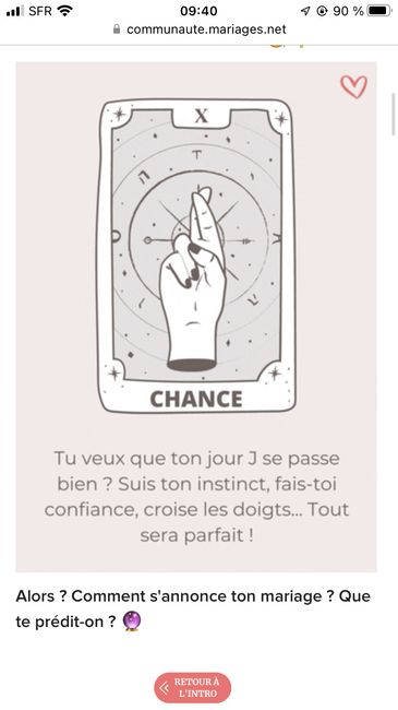 On souhaite voir ton compteur sur Mariages.net ❤️ Tu le partages en commentaire ? Let's gooooo 😎 *** Sur ce jeu on te lit ton avenir nuptial >> Jour de chance : les Admins tirent les cartes de ton mariage 🔮