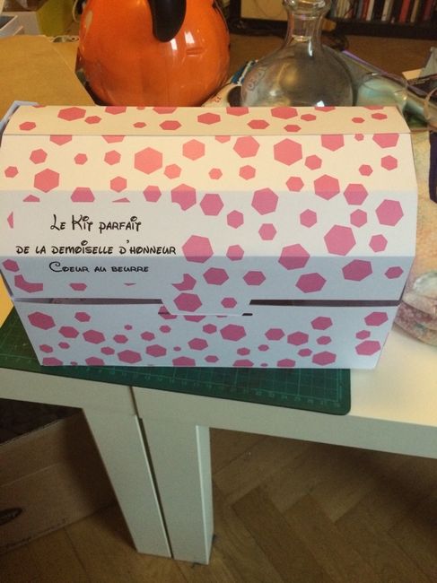 Hello ! Aujourd'hui j'ai fait mon premier test de boîte pour les kit de demoiselle d'honneur. J'ai trouvé le tuto sur un blog que j'adore ! Pour le moment il contient un carnet, une gomme et un crayon, un paquet de mouchoir, une fiche et des...