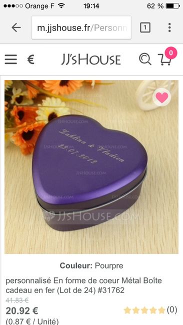 Bonsoir, j'aimerais savoir si vous savez ou je pourrais trouver des boites à dragées de couleur parme s'il vous plait?