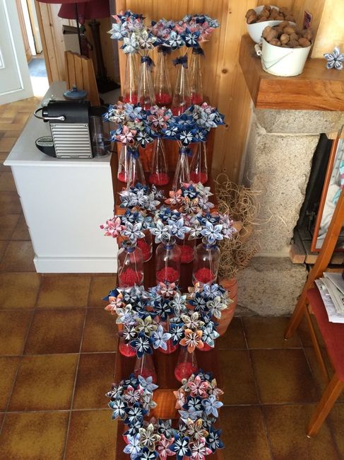 Voilà nos bouquets pour les centres de tables, 24 en tout (on a 16 tables mais parfois on en met plusieurs), on en a passé du temps à faire toutes ces fleurs en origami !!