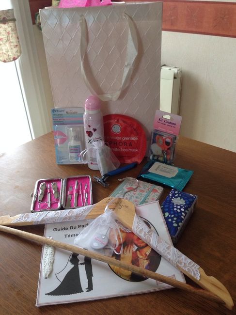 Bonjour à tous, Aujourd'hui je partage mon kit temoin pour les filles que j'ai fait en 4 exemplaires ! (2 témoins mairie et 2 eglise). J'en offre un ce soir ! J'espère que ça lui plaira ! J'ai mis, un masque sephora énergisant, un mini kit couture,...