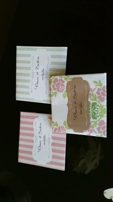 Bonjour à toutes! Aujourd'hui j'ai commencé mes pochettes à confettis entièrement fait maison, confettis inclus! J'ai imprimé les modèles dispo gratuitement sur internet, puis atelier pliage. Pour les confettis j'ai acheté une perforatrice coeur chez...