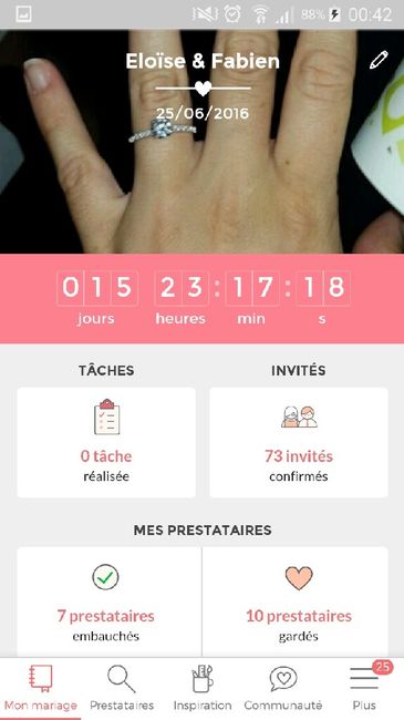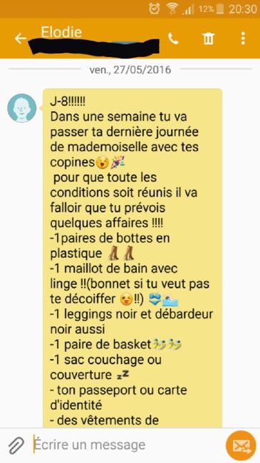 Je mangeais transuillement et biiiim je reçois LE message ! Des bottes plastiques?! Un duvet?! Ça tourne pas rond chez ma témoin et ma soeur (c'est elles qui organisent) bref je flippe mais j'ai hâte et en MM tps c'est bizarre de se dire qu'on va...