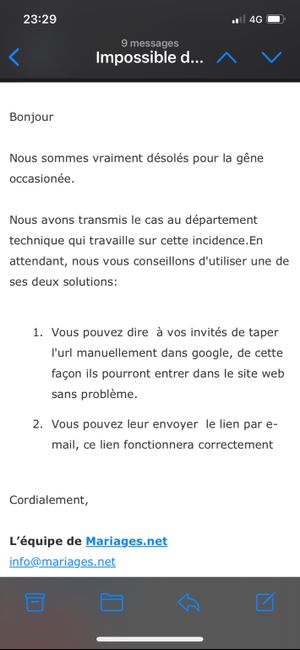 Bonjour à toutes et à tous, Avec mon chéri on a créé un site internet mais depuis ce matin nos invités n'y ont plus accès. Cela nous met "vérifier la connexion". Sur les iphones ça fonctionne mais pas sur Android.... Merci d'avance pour votre aide ! ...