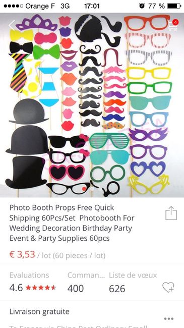 Coucou ! Ce matin j'ai reçu ma premiere commande passée sur aliexpress et je suis RAVIE !!!J'ai commandé des accessoires pour notre photobooth, à moins de 4EUR les 60 pieces, livrés avec des les baguettes à monter nous mêmes. Premier achat pour le...