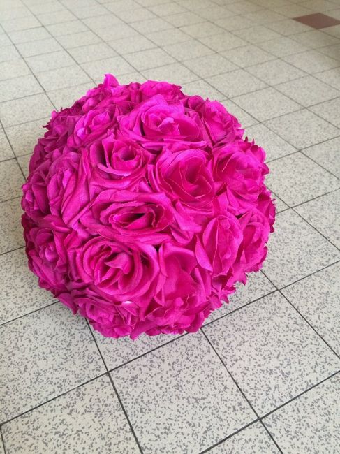 Bonjour, suite à mon dernier post, où j'expliquais ce que je voulais faire avec des boules de fleurs, à l'entrée de ma salle, mais où il me manquait le ruban pour accrocher la boule au piquet.... Et voici le resultat final... J'adooooore !!!