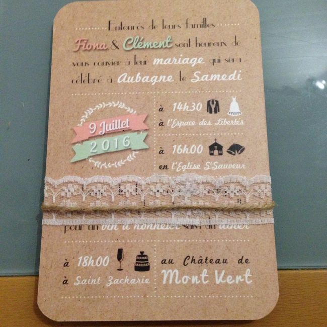 Bonjour, Nos faire-parts viennent de partir pour notre mariage le 9 juillet prochain! Quel soulagement!! Une bonne chose de faite! Je vous mets des photos du faire-part que nous avons confectionnés nous-mêmes...