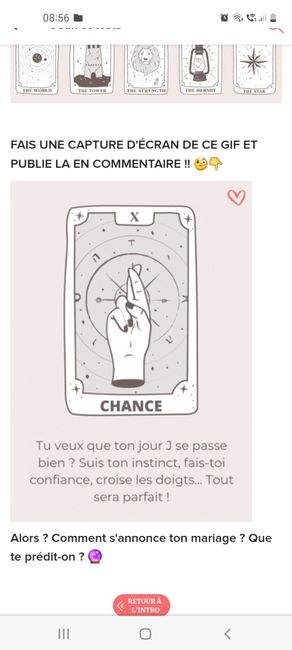 Coucou tout le monde 💜 Merci d'avoir participé jusqu'au bout ! Maintenant qu'on en sait un peu plus sur ton mariage, on va pouvoir tirer les cartes... FAIS UNE CAPTURE D'ÉCRAN DE CE GIF ET PUBLIE LA EN COMMENTAIRE !! 🧐👇 Alors ? Comment s'annonce ton...