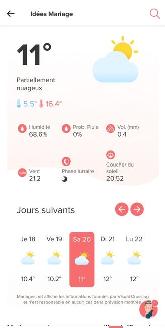 Coucou commu ✨ Ce n'est pas une blague !! Mariages.net te prédit la météo de ton mariage !! Une nouvelle fonctionnalité pour mettre toutes les chances de ton côté de prévoir quel temps il fera le plus beau jour de ta vie ❤️ Cet outil se base sur les...