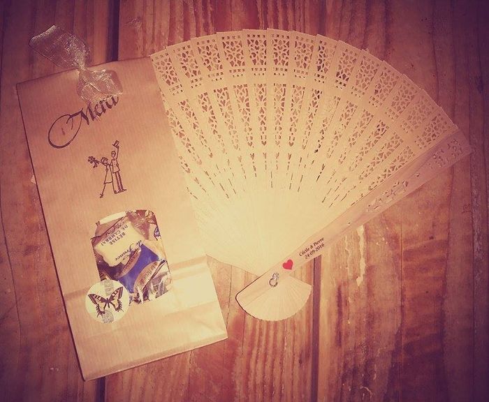 Voici mes cadeaux invités ! Un petit sachet de douceurs (michoko, caramels beurre salé et parfumés, bêtises de Cambrai, nougat amande et chocolat) fait main avec en plus un éventail en bois à l'éfigie du mariage, pratique pour la soirée dansante et...