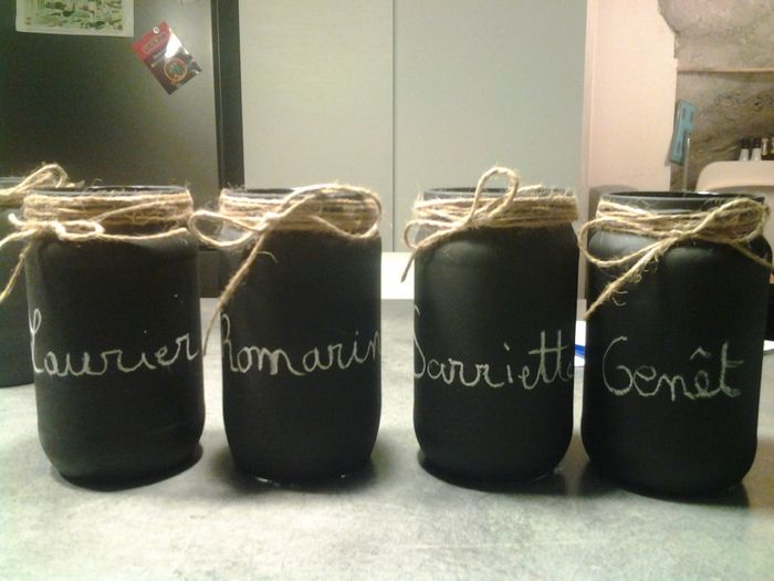 Coucou, Hier soir nous avons terminé nos 14 vases dans lesquels il y aura des branches d'olivier et de gipsophyle, dans un thème ardoise, et rappelant la végétation de notre garrigue. J'ai décliné avec les pots à crayon pour occuper les enfants...