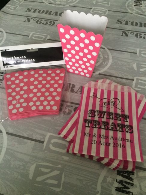 Ce matin jai recu des pots a popcorn et des sachets pour bonbons personnalisés pour mon future candy bar, très contente du resultat! Et j'attends d'autres colis dans la semaine prochaine, j'adore...