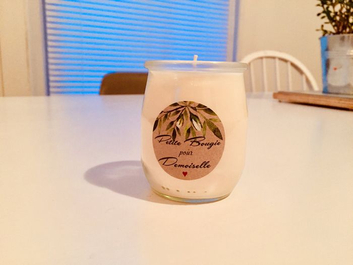 Bougie en cours de fabrication (manque le tissu pour recouvrir avec la petite attache) mais contente du résultat et des étiquettes. Une chose est sûre on mange beaucoup de yogourt la laitière en ce moment 😋