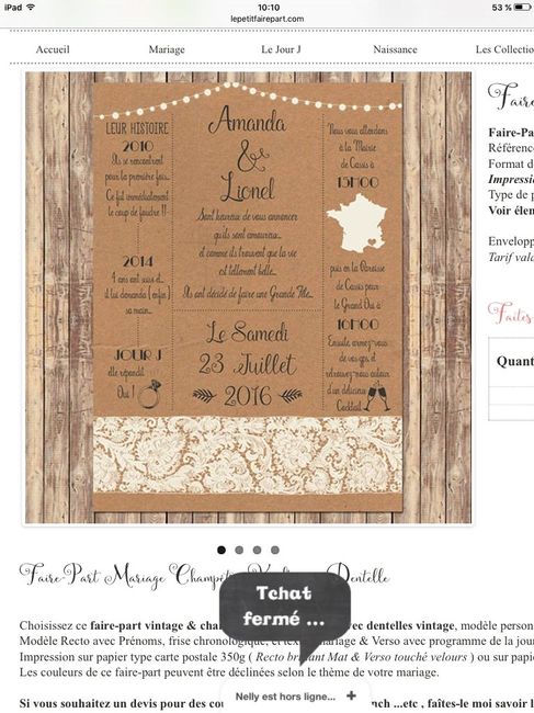 J avoue que je suis curieuse de voir vos faire parts de mariage. Le mien sauf qu a la place du ruban sur la photo je mettrais un ruban en dentelle. Il est simple mais je n ai pas de code couleur pour mon mariage alors je voulais rester dans la...