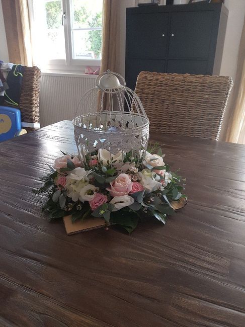 Coucou , voici mes centres de table. Je suis contente du rendu car la 1ere fois ça n'allait pas du tout et je l'ai fait refaire à la fleuriste.Le bougie sera un peu plus surélevé car la on ne la voit quasiment pas.Le carton s'est juste pour la...
