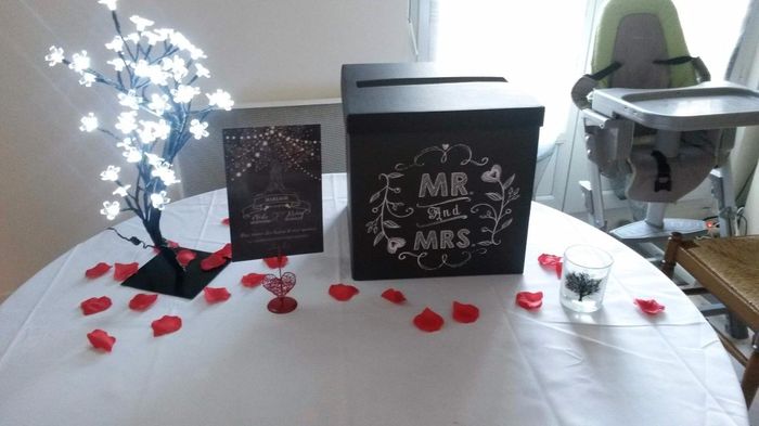 Simple, toujours avec une touche de rouge. J'adore. Maintenant il faut que je trouve qqchose qui me plaise pour le "livre d'or"... Déco table urne