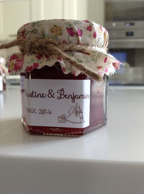 Juste pour vous dire que je suis ravie , et que grâce à mariages.net et à certaines d'entres vous j'ai trouvé ce prestataire formidable : le songe du verger !Donc j'ai reçu aujourd'hui mes confitures abricot et fraise mara des bois , avec étiquettes...