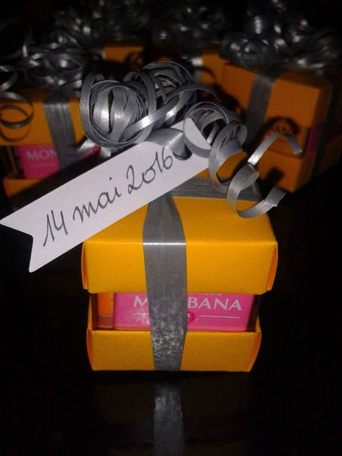 nos petites boites à douceurs ( 8 carrés chocolat ) pour les invités exit les dragées trop communs les voilà arrivés , nos petites boites de 8 chocolats différents en respectant notre code couleur (jaune et gris) elles seront posés sur la table du...