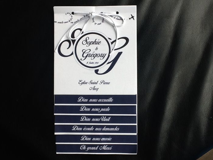 Je cherche un moyen de relier mon livret de messe j ai rajouté un 3 eme essai avec ruban blanc et bleu marine ( mon homme est en bleu marine et moi blanc nacrée ) soyez critiques ca m aide merci les filles dites moi celui que vous aimez et pourquoi...