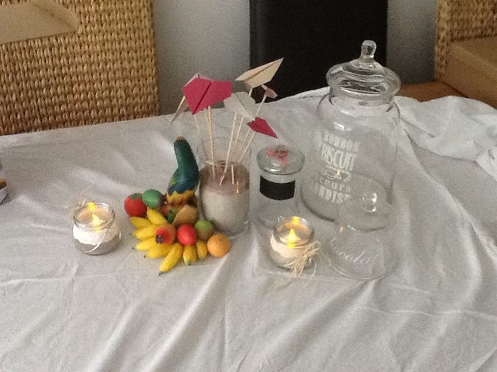 Chaque table est décoré en fonction du pays que nous avons déjà visité et la table d honneur est le voyage de noce il manque les menus et dans chaque vase le numéro de la porte d embarquement ... Les nappes seront blanches serviettes blanches housse...