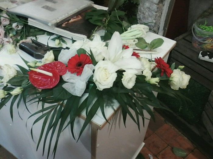 Voilà j'ai fais un essaie pour le mariage mon bouquet et ma composition qui elle va servir à décorer la mairie et la table d'honneur j'ai mis 20EUR par composition après mon bouquet est pas totalement fini car elle va rajouter du tulle et autre pour...