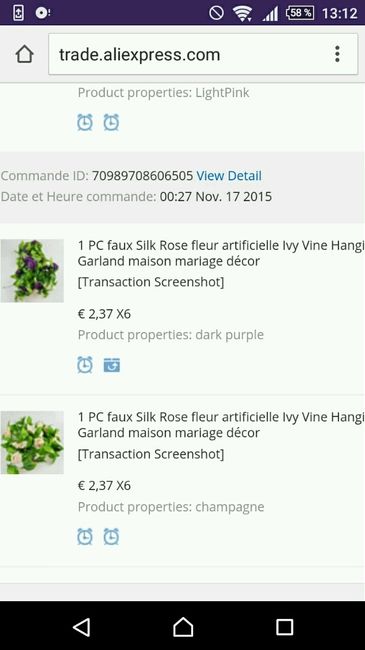 Petite commande aliexpress passée pour voir les fleurs si la qualité nous plaît. Des guirlande de fleurs pour les rambardes de la salle à l'entrée et des petits bouquets de différentes couleur pour faire des plus gros bouquets.