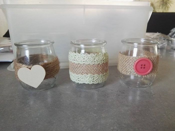 Actuellement en arrêt, faut bien que je m'occupe car les journées sont longues!!!! Alors voilà, je m'y met même si je suis pas super manuelle.... J'ai testé la création de photophores, je vais acheté des bougies chauufe plat à led pour le jour J...