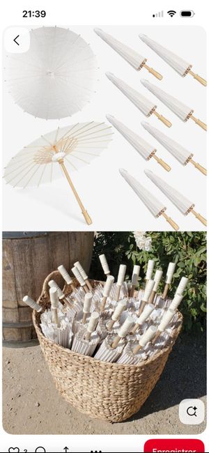 Bonjour, le lieu de mon mariage est très peu ombragé et le mariage en été. J’envisage de mettre des ombrelles en papier à disposition. Qu’en pensez-vous ? Quelle taille d’ombrelles prendre ? 60cm de diamètre? 80cm? Si vous avez des photos avec des...
