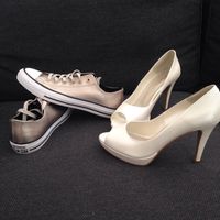 Il y a 3696 joursBeaucoup d'entre vous se demande quoi mettre en chaussure en seconde partie .. Moi j'ai trouvé mon bonheur .. Partie 1 talon et quand il sera temps d'enflammer la piste de danse partie 2 converses.... Avec ma robe ivoire je reste dans les tons ?