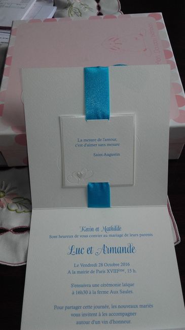 Bonjour les Brides! Je suis trop contente nous avons reçu nos faire-parts aujourd'hui, j'avais une petite apréhension et finalement je les trouve très photo 1 photo 2 jolis, je suis contente du rendu.N'hésitez pas à me donner votre avis!